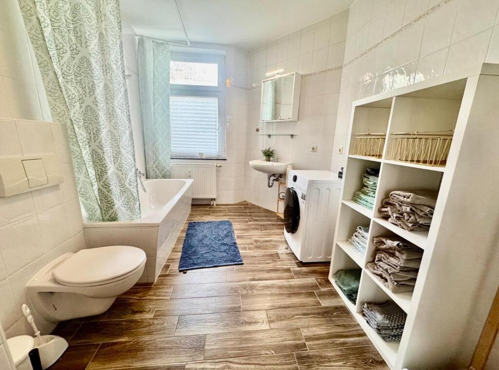 Die vollständig eingerichtete Küche lädt zum gemeinsamen Kochen ein, das helle Wohnzimmer mit Flachbild-TV zum Entspannen. Ein Badezimmer mit Badewanne sowie eine Waschmaschine sind ebenfalls vorhanden. Kostenloses WLAN ist selbstverständlich inklusive.